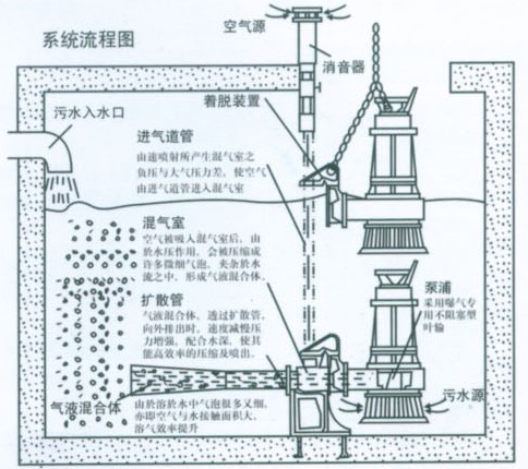 潛水噴流式曝氣機適用于生活污水,工業污水,畜牧業排水處理以及一般污水管道(渠)和使用活性污泥法處理工廠排水設施的曝氣槽,可單獨或組合使用。